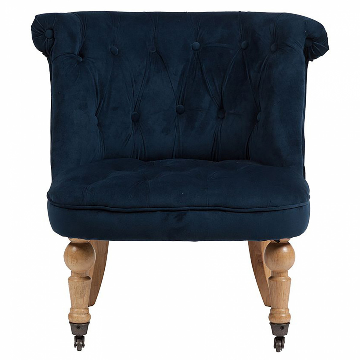 Изысканное кресло Amelie French Country в стиле модерн сделает дизайн интерьера любого дома ярким и изысканным. Шикарная обивка деревянного каркаса с кнопками выполнена из высококачественного велвета сочного синего цвета. Сидение имеет необычайно удобную форму — изогнутость спинки повторяет очертание спины человека, поэтому такое кресло не только украсит ваш дом, но и станет комфортным местом для отдыха. Ножки, оборудованные латунными колесиками, изготовлены из прочного натурального дерева насыщенного коричневого цвета.